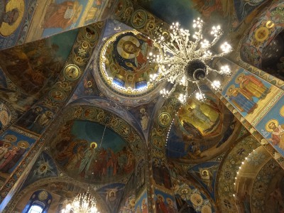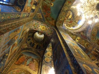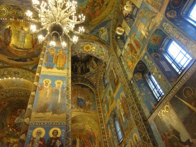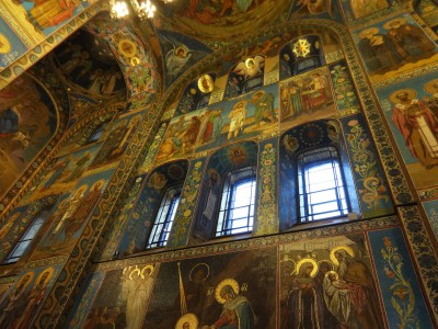 Antes de ver la catedral por dentro os recomiendo no dejar de contemplarla por fuera hasta saciarse. Para eso sólo tenéis que ir recorriendo la avenida Nevski día tras día fijando vuestras miradas en ella. Intentad no perderla de vista durante todo el viaje. Tenéis que llegar a conocerla por la mañana, en un día de sol, en un día de chubascos (y si puede ser, también de nieve), al anochecer y de noche… Intentad verla no sólo desde el puente del canal Griboyédoba que es donde todo el mundo hace fotos con la Spas na kraví de fondo, sino también desde el jardín Mijáilovski o pasando por debajo de los puentes del canal en un barco turístico… Sólo después, cuando se borre de vuestras mentes aquella alegre imagen de mucho colorido que presenta la Spas na kraví en la mayoría de los folletos, libros y otros medios pensados para los viajeros, id a las taquillas.