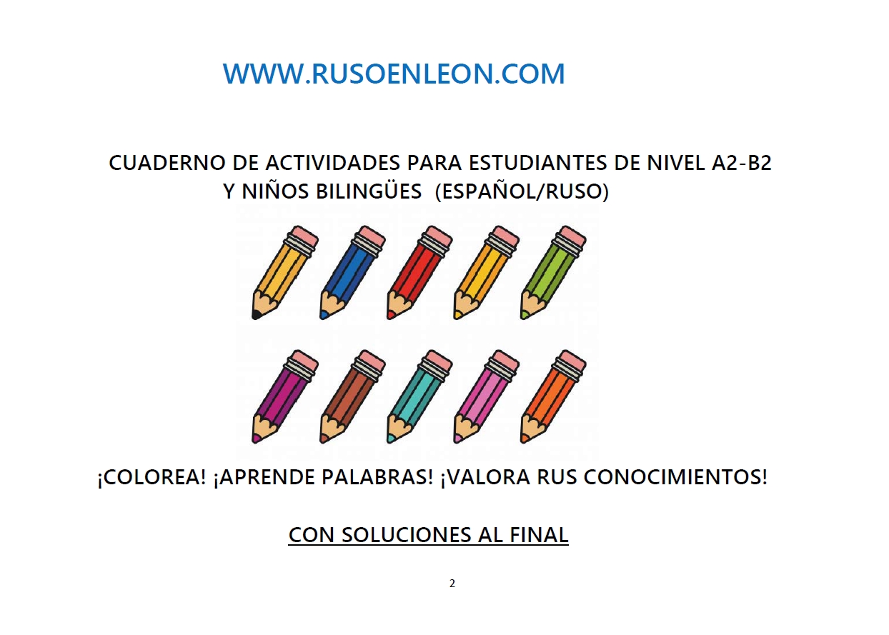 Esta vez os quiero proponer un CUADERNO DE ACTIVIDADES que se titula "¡COLOREA! ¡APRENDE PALABRAS! ¡VALORA TUS CONOCIMIENTOS!" y puede ser muy útil para los estudiantes de niveles A1-B2 y niños bilingües (español/ruso).