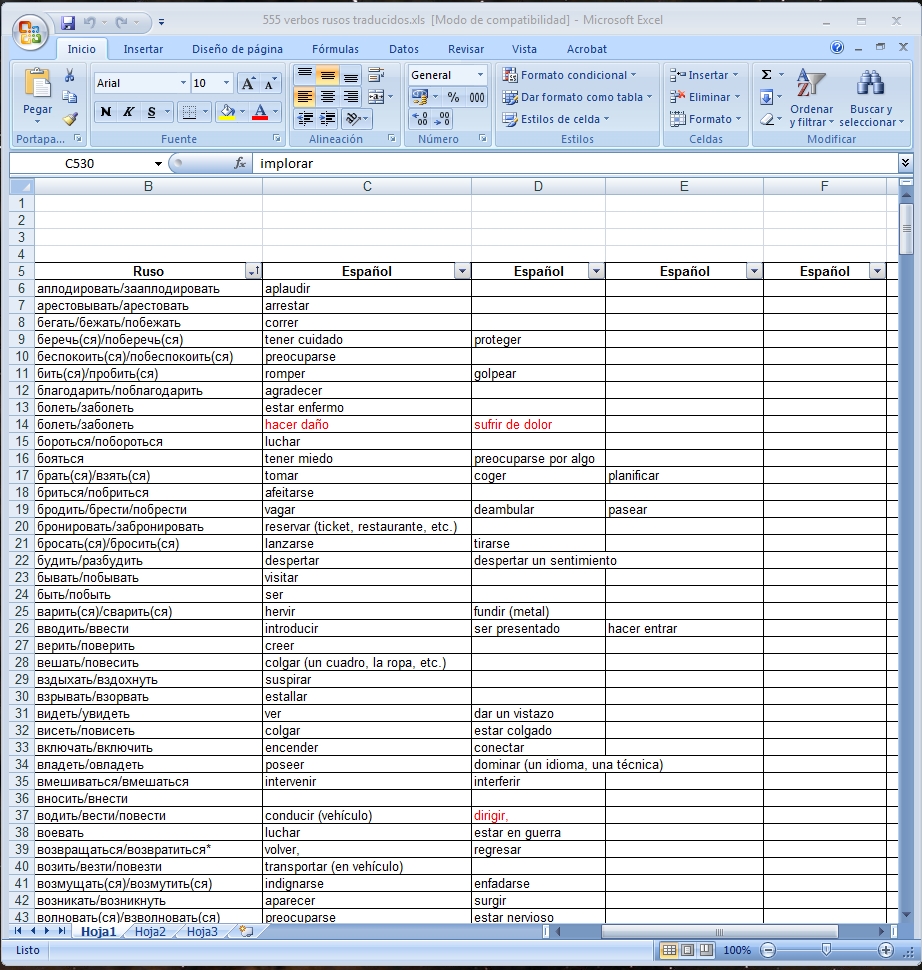 La lista de los 555 verbos rusos me pareció fantástica, es como si fuera un buen diccionario de verbos con sus dos aspectos y con una gran variedad de equivalentes en español, desde los más básicos y comunes hasta algunos bastante poco usuales y otros que tienen uso coloquial. Una lista exquisita, gracias a la cual hasta pude aprender algunos verbos españoles que no conocía y acordarme de otros que tenía completamente olvidados. Mis agradecimientos personales a Gaby por este archivo tan genial.