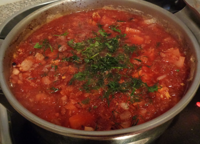 7. Luego añadimos dos dientes de ajo triturados, un poco más de sal, pimienta negra molida y en grano (ambas) y un poco de perejil y de eneldo frescos. Y la dejamos reposar un rato. Cuanto más tiempo esté reposando, mejor color va a coger, así que no os preocupéis si os parece que la sopa no sale suficientemente roja, ya cambiará unas horas más tarde, y al día siguiente parecerá igual que la de las fotos que aparecen en los libros de cocina rusa.