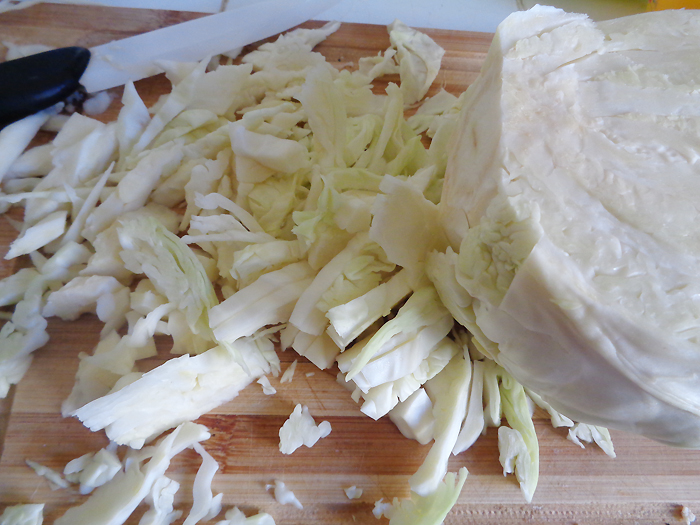 4. Ahora tenemos que cortar el repollo así como indica la foto que hice. Cuanto más finos sean los trozos, más rápido se cocerán.