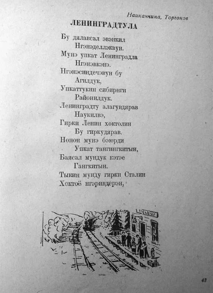El título del libro y su contenido vienen en evenki y es difícil adivinar de qué se tratan los poemas seleccionados. Pero si le echamos un vistazo a la página del contenido, encontraremos algunas palabras rusas (пионер, октябрёнок) y también otras que, a pesar de ser evenki, se leen gracias a su raíz rusa (комсомолиги, лагерьду, студентыл, etc.)