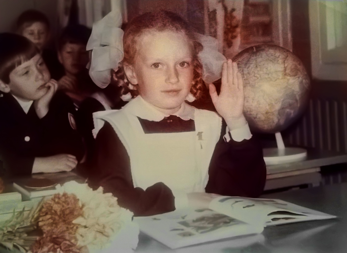 En Livejournal que visito casi a diario a veces se puede encontrar artículos muy interesantes relacionados con la vida en la URSS, y suelo echarles un vistazo. Resulta que pocos días después de que publicara el segundo artículo de este tema alguien escribió una entrada sobre la vida escolar en la Rusia soviética de los 1970-80, y aquella entrada tuvo un montón de comentarios de la gente que quiso compartir sus recuerdos con el autor del texto. Algunos de ellos los publico aquí y los traduzco (con el permiso previo de los usuarios de aquel blog): «Советские тетради были очень простыми, без картинок, без оформления. На обратной стороне всегда можно было встретить или таблицу умножения, или слова детских советских песен, или текст гимна СССР. Тетрадки были скучных блёклых цветов, обычно зелёные или голубые». “Los cuadernos soviéticos eran muy sencillos, sin dibujos, sin diseño alguno. En la contraportada siempre se podía ver la tabla de multiplicar, letras de canciones infantiles soviéticas, o la letra del himno de la URSS. Los cuadernos eran de colores aburridos y pálidos, generalmente verdes o azules”. «Наша учительница, которой было 18 лет и у которой мы были первыми учениками, забирала прописи на проверку, и тем, кто написал задание лучше всех, приклеивала на обложку тетрадки красивую картинку. Она тратила своё время на то, чтобы вырезать разных зайчиков и мишек из старых открыток и счастливчикам на другой день доставалась тетрадь с яркой весёлой обложкой».“Nuestra maestra que tenía 18 años y para la cual éramos sus primeros alumnos, recogía los cuadernos de escritura y luego en casa pegaba unos dibujos bonitos a la cubierta de aquellos cuyos dueños hicieron los deberes mejor que el resto. Se gastaba su tiempo en recortar conejitos y ositos de las postales viejas, y con un poco de suerte podías obtener un cuaderno de aspecto alegre y divertido”. «Те современные женщины, что застали школьную форму 1980-90, ненавидят коричневый цвет в одежде! Почему? А потому что им сразу вспоминается коричневое школьное платье с чёрным фартуком! Носить его нужно было и осенью, и зимой, и весной – одно на весь год! Кроме того, полагалось носить это платье с коричневыми или чёрными бантиками – то ещё сочетание! А по праздникам обязательно нужно было надевать белый фартук, белые колготки и белые бантики».“Aquellas mujeres modernas que en los 1980-90 llevaron el uniforme escolar, odian el color marrón en la ropa. ¿Por qué? ¡Porque enseguida recuerdan el vestido escolar de color marrón y el delantal negro! Había que ponérselo tanto en otoño, como en invierno y en primavera, ¡se tenía un solo vestido para todo el año escolar! Además, se recomendaba llevar aquel vestido con unos lazos en el pelo de color marrón o negro, ¡menudo conjunto! Y los días de fiesta había que ponerse el delantal blanco, los panties blancos y los lazos blancos”. «Чтобы хоть как-то разнообразить скучную школьную форму, мамы и бабушки "отрывались" на воротничках и фартуках: их шили из кружев, импортного гипюра, вязали крючками, шили фартуки интересных фасонов. Девочки старались украсить школьные платья бусинками или нашивками, но учителя их ругали и просили это тут же исправить».“Para hacer que el insípido uniforme escolar fuera menos monótono, las madres y las abuelas mostraban su lado creativo cosiendo cuellos de vestidos y delantales a mano. Los cuellos los hacían con el ganchillo, bordados o de telas caladas de importación. Para los delantales inventaban unos diseños propios y elegantes. «Воротнички платьев в выходные отпарывались, стирались и пришивались снова. Они пачкались куда быстрее самого платья». “Los cuellos de los vestidos se descosían los fines de semana, se lavaban y se volvían a coser. Es que se ensuciaban mucho antes que el vestido”. Y aquí tenéis unos ejemplos de aquello. Un collage de los cuadernos soviéticos y una foto mía del colegio (fui con 7 años): La_profe.