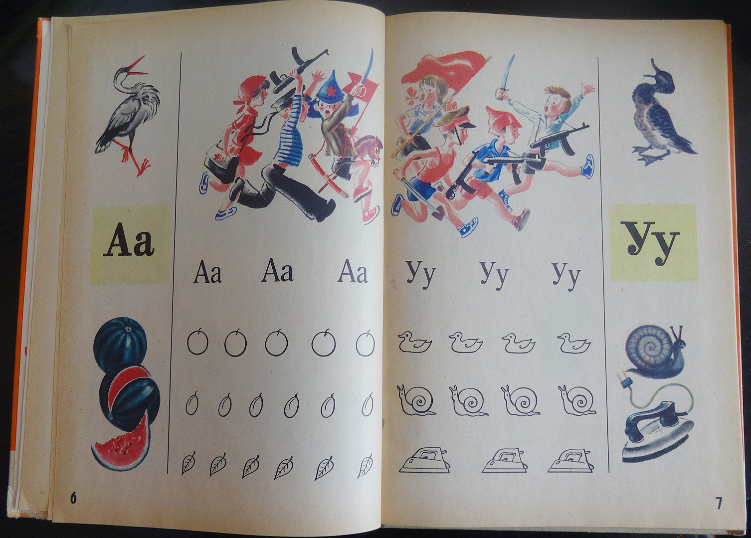 El segundo libro fue editado en 1975, pero mi madre para entonces ya era una adolescente, y yo empecé a estudiar bastante más tarde y tenía alguna edición posterior, así que ninguna de las dos puede acordarse de él. Es un abecedario, una “азбука” con muchos dibujos. A pesar de no haber conocido este libro de pequeña, puedo reconocer la manera de dibujar de su autor. Creo que hizo dibujos para muchos, si no para todos los libros de texto soviéticos de los años 1970-80. Hablaré de este otro regalo también, más adelante.