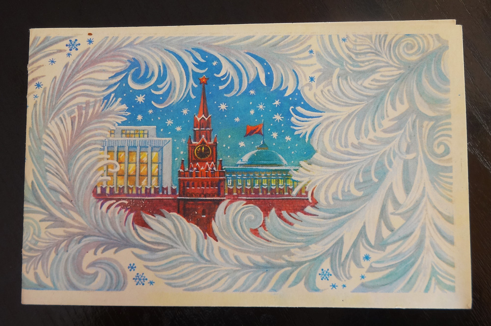 Una imagen del Cremlin en un Moscú nevado. Esta postal la había comprado mi tía, en aquella época una colegiala, para felicitar a una de sus profesoras.