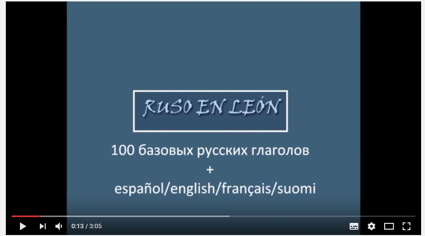 Hola a todos, Deciros que nuestro canal de Youtube RUSOENLEON COM… ¡Ya tiene 45 seguidores! Por supuesto, quisiera volver a agradecer a Manuel Fernández su colaboración sin la cual este éxito no sería posible, y también ofreceros un vídeo nuevo: 100 verbos básicos rusos con texto en cursiva y traducción a cuatro idiomas: español, inglés, francés y finés.https://www.youtube.com/watch?v=wtdhdjwRgS8Creo que el vídeo no sólo puede ser útil para memorizar los verbos rusos esenciales, sino también para: - aprender a escribirlos en cursiva