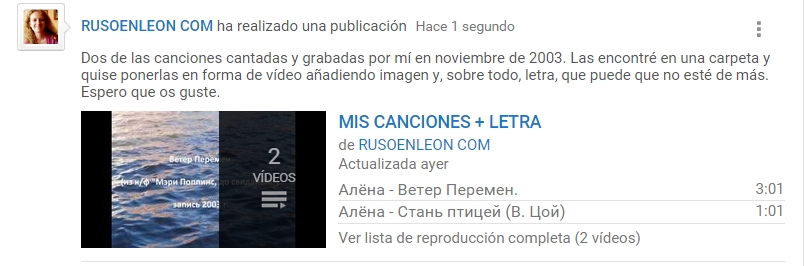 ¡Muchas gracias a aquellos que ya os habéis suscrito al canal de Youtube RUSOENLEON COM! Si tenéis alguna sugerencia, podéis dejar un mensaje aquí. Durante las próximas semanas iré subiendo más vídeos, entre los cuales habrá dictados, relatos, vocabulario, etc. Y mientras tanto, además de ver los vídeos ya publicados, podéis escuchar unas canciones que había cantado con la guitarra y había grabado hace ya bastantes años y que econtré de milagro en un CD de aquella época: "Ветер перемен" (из к/ф "Мэри Поппинс, до свиданья!" СССР, 1984)запись 2003 года. https://www.youtube.com/watch?v=S3ZshVx ... Q3BfrCZCrr"Стань птицей" (В. Цой)запись 2003 года. https://www.youtube.com/watch?v=EBsivHG ... Q3BfrCZCrrUn saludo. La_profe.