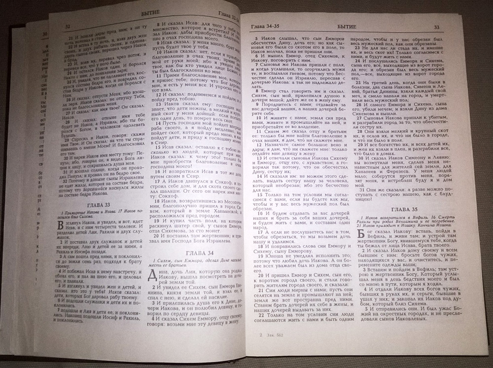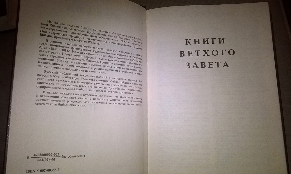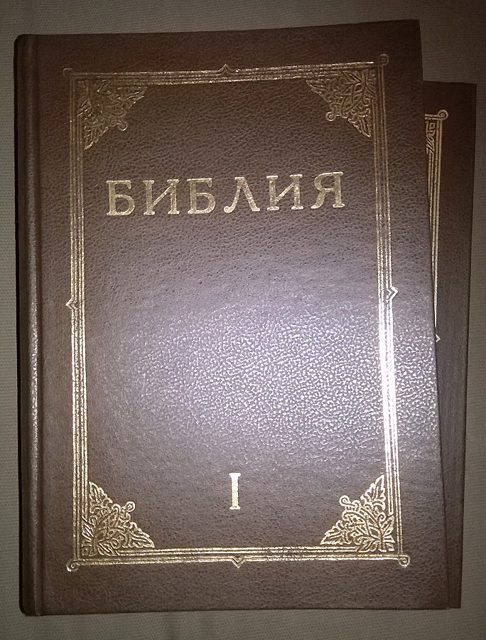 La traducción de la Biblia que tengo en San Petersburgo es la de 1876, pero el libro es una edición de 1990. Viene en dos tomos. Me acordaba de ella, la intenté leer varias veces en distintas épocas de mi vida, y decidí preguntar a mi hermana si sabía dónde estaba y si me podía hacer alguna foto de ella. Mi hermana me contestó que no sólo sabía perfectamente dónde estaba, sino que de vez en cuando le echaba un vistazo. Cuando la pregunté por qué lo hacía, me dijo que era bueno leer algo así de vez en cuando. No dijo más.