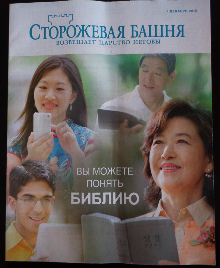 Hice lo que tenía que hacer, salí a la calle muy contenta de haber disfrutado de la atmósfera rusa inconfundible que reinaba en la oficina del consulado y me paré para guardar los documentos en una carpeta. Cuando ya estaba cerrando el bolso, vino hacia mí una señora de cuya presencia en la calle ya me había percatado. La vi de reojo mientras luchaba con la incómoda carpeta de plástico, me di cuenta de que que tenía una cara muy rusa, y cuando se me acercó pensé que iba a preguntarme algo sobre el consulado. Pero resultó que ella era… testigo de Jehová.