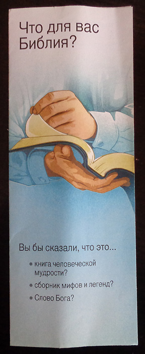 Me preguntó si tenía tiempo, y como le dije que sí lo tenía, empezó a hablarme, muy rápidamente y en un ruso malísimo por ser matizado de su ucraniano materno, de la lectura de la Biblia en nuestra época y de la poca atención que se le prestaba. Me dio un curioso folleto, este: