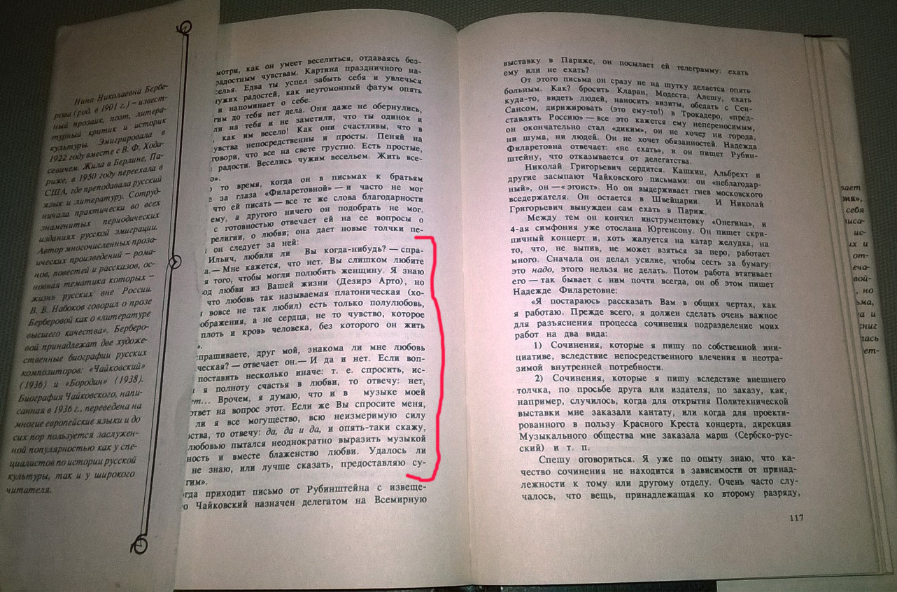 Berbérova quedó perfectamente informada sobre la vida íntima de Chaikovski, sin embargo decidió dejar de buscarle respuestas a “la cuestión” y no quiso investigar sobre los posibles por qués. Quizá ya no sabremos si fue la educación de pequeño Chaikovski que le llevó a vivir la vida tan trágica y tener achaques nerviosos, o fue consecuencia de alguna enfermedad, al menos no lo sabremos del libro de Berbérova. También puede ser que otros biógrafos de Chaikovski ya hayan escrito bastante sobre eso, pero lo que intentó hacer Berbérova fue reconstruir la vida sentimental del compositor de los pequeños fragmentos hallados en los diarios, cartas, diálogos con la gente que le conoció. Y en eso tuvo éxito.