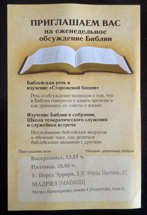 Hice lo que tenía que hacer, salí a la calle muy contenta de haber disfrutado de la atmósfera rusa inconfundible que reinaba en la oficina del consulado y me paré para guardar los documentos en una carpeta. Cuando ya estaba cerrando el bolso, vino hacia mí una señora de cuya presencia en la calle ya me había percatado. La vi de reojo mientras luchaba con la incómoda carpeta de plástico, me di cuenta de que que tenía una cara muy rusa, y cuando se me acercó pensé que iba a preguntarme algo sobre el consulado. Pero resultó que ella era… testigo de Jehová.