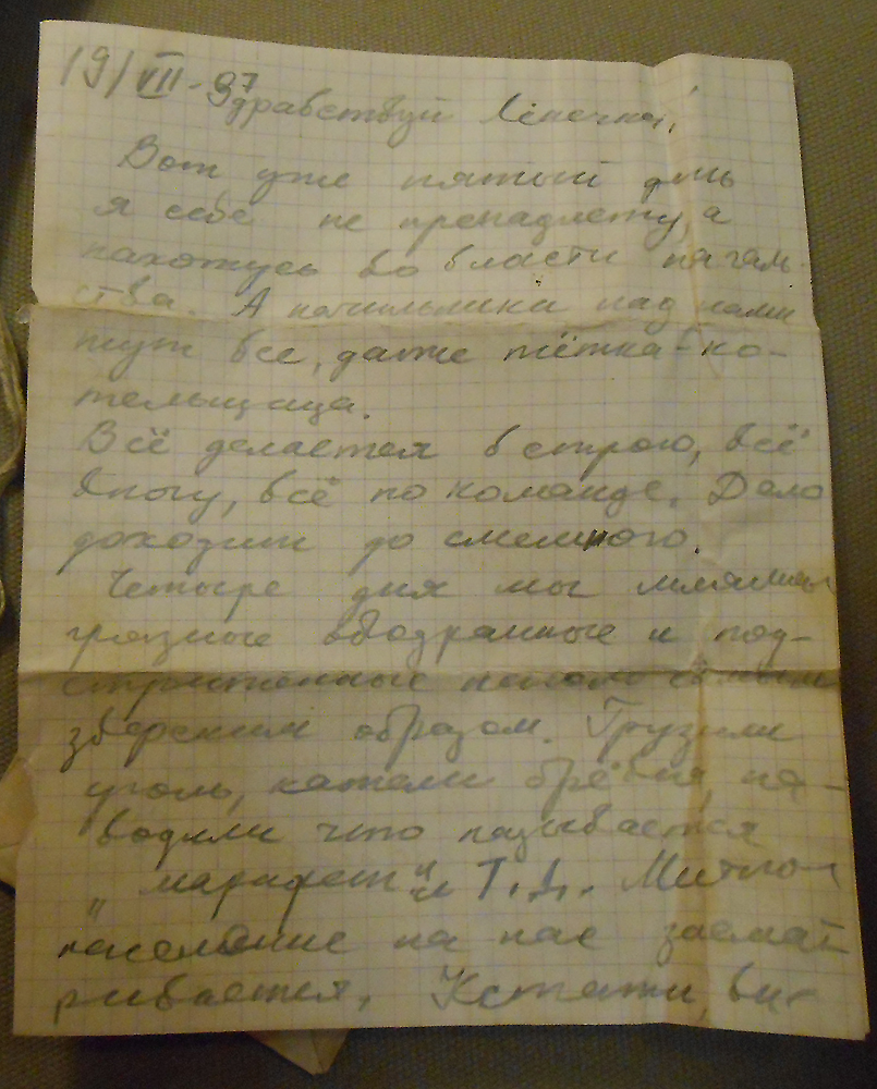 Pues nada, Liónechka, ya es el día siguiente. Ahora creo que sí podré terminar la carta. Todo el pelotón se ha ido a realizar una tarea, aquí sólo quedamos dos. Estoy haciendo de guardia en la galera.