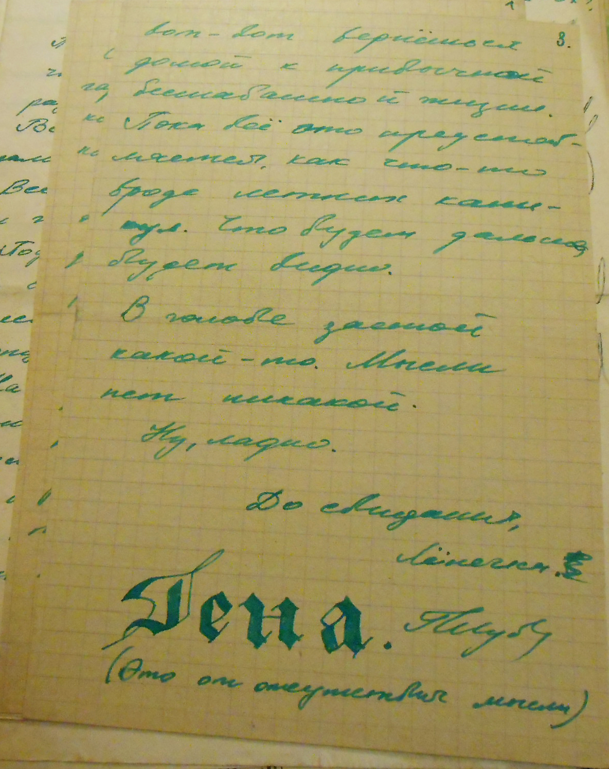 Y luego llegué al regimiento y enseguida entré en clase. Después comenzó la autopreparación y me puse a escribir esta carta. Después cenamos y ahora tenemos tiempo libre. Y en este momento estoy aquí sentado (bueno, en realidad estoy de pie, porque mi taburete está ocupado por los jugadores del dominó) escribiendo.