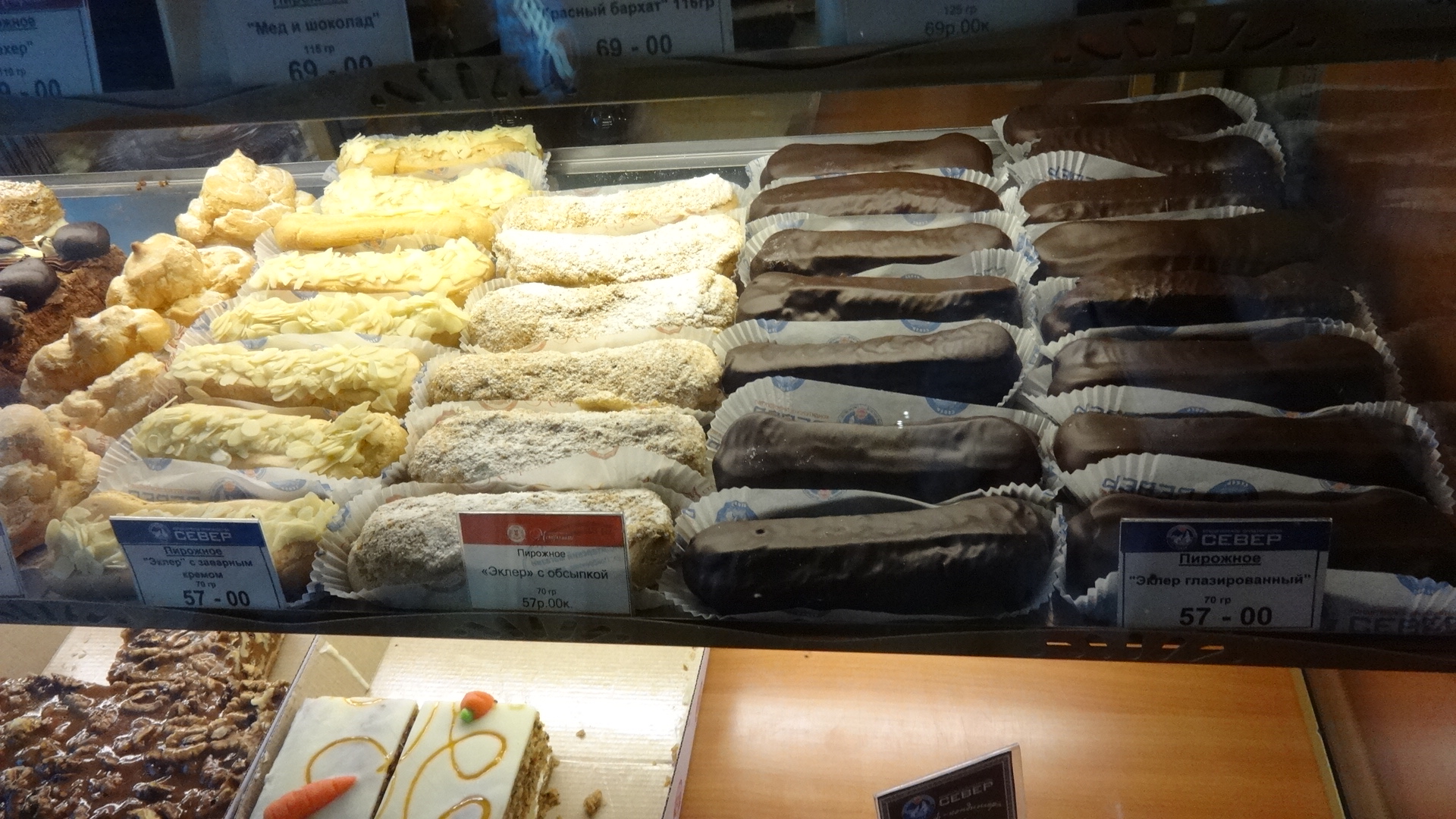 El tercer día de mi estancia en Piter era el cumpleaños de mi hermana y al volver de un paseo por la Nevski entré en una confitería pequeña que pusieron no hace mucho en mi barrio. Viendo que la dependienta era un poco lenta y que delante de ella se había formado una pequeña cola, hice unas fotos de los escaparates: