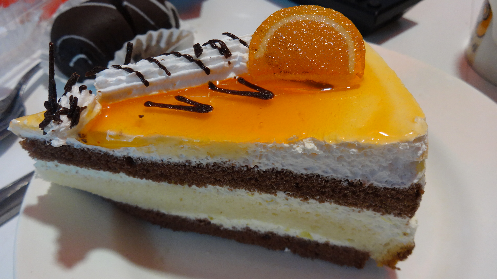 Al final escogí la tarta más llamativa adornada con gelatina color naranja y sirope de chocolate. Se llamaba “Апельсиновый флирт” (“Flirteo de naranja”). Cuando llegó mi turno, pregunté a la dependienta qué tenía aquella tarta dentro, y ella abrió un catálogo de “Siéver” para buscar la tarta por su nombre y su imagen y leerme la descripción.