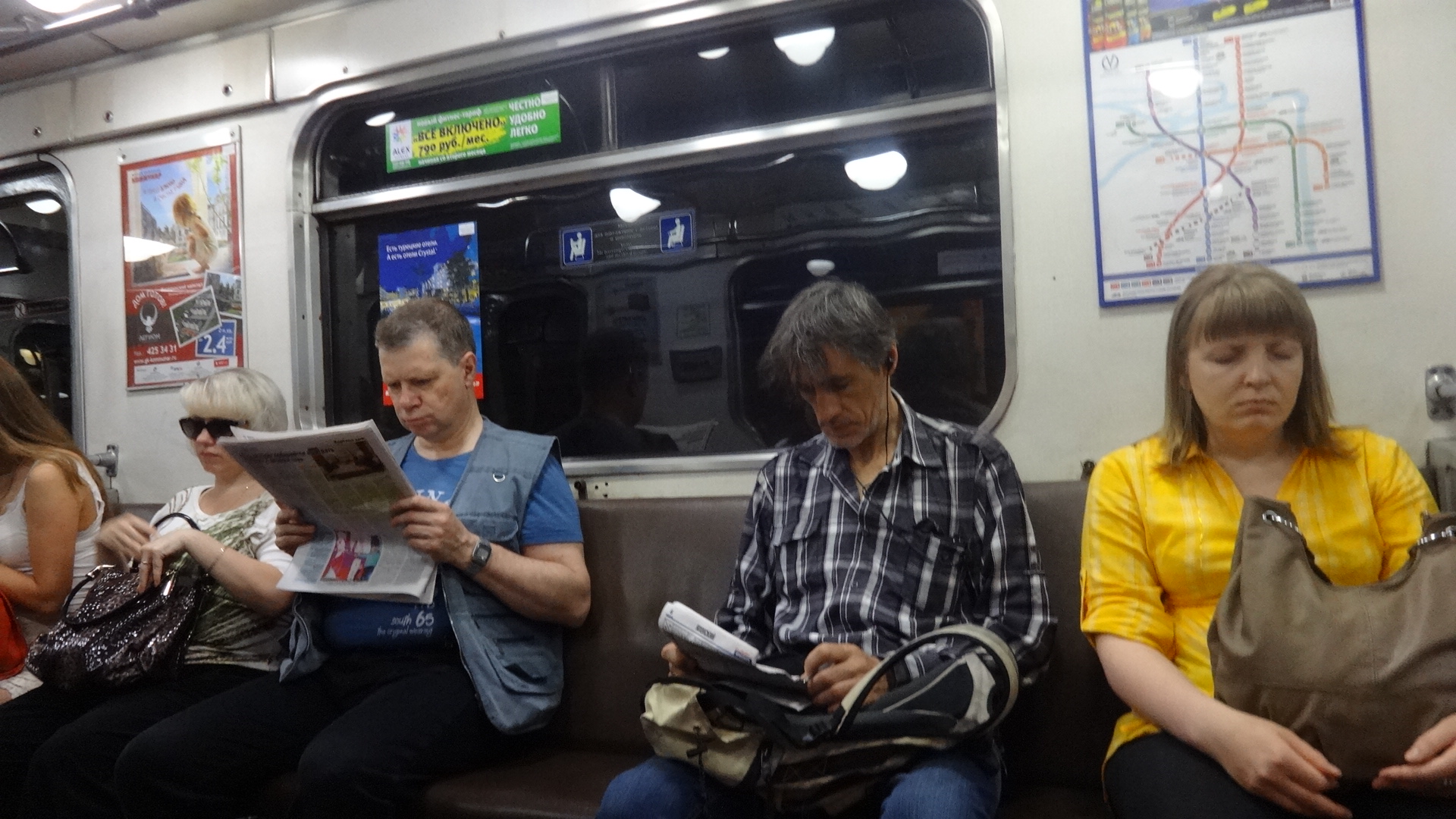 La gente que viaja en metro suele llevar consigo libros, revistas y periódicos, pero luego casi todos que van sentados cierran los ojos y aprovechan el viaje para descansar. En los últimos años se han podido ver algunas personas con los libros electrónicos, pero no son muchas simplemente porque a la gente le da miedo llevar estos accesorios tan llamativos y atractivos en el metro donde sigue habiendo muchos ladrones.