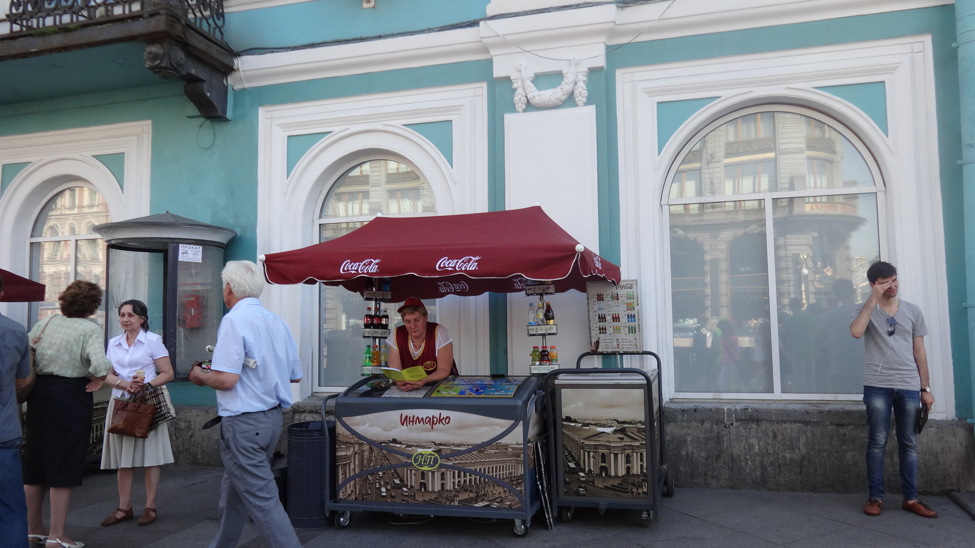 Si un día de verano pasáis por la Nevski y os apetece tomar agua fría o un té verde helado con limón, no dudéis en comprarlos en aquellos puestos. Pero antes preguntad si están fríos. Algunos de los puestos no tienen frigoríficos y sus dueños intentan enfríar las bebidas con hielo. Sin resultado, claro.La_profe.