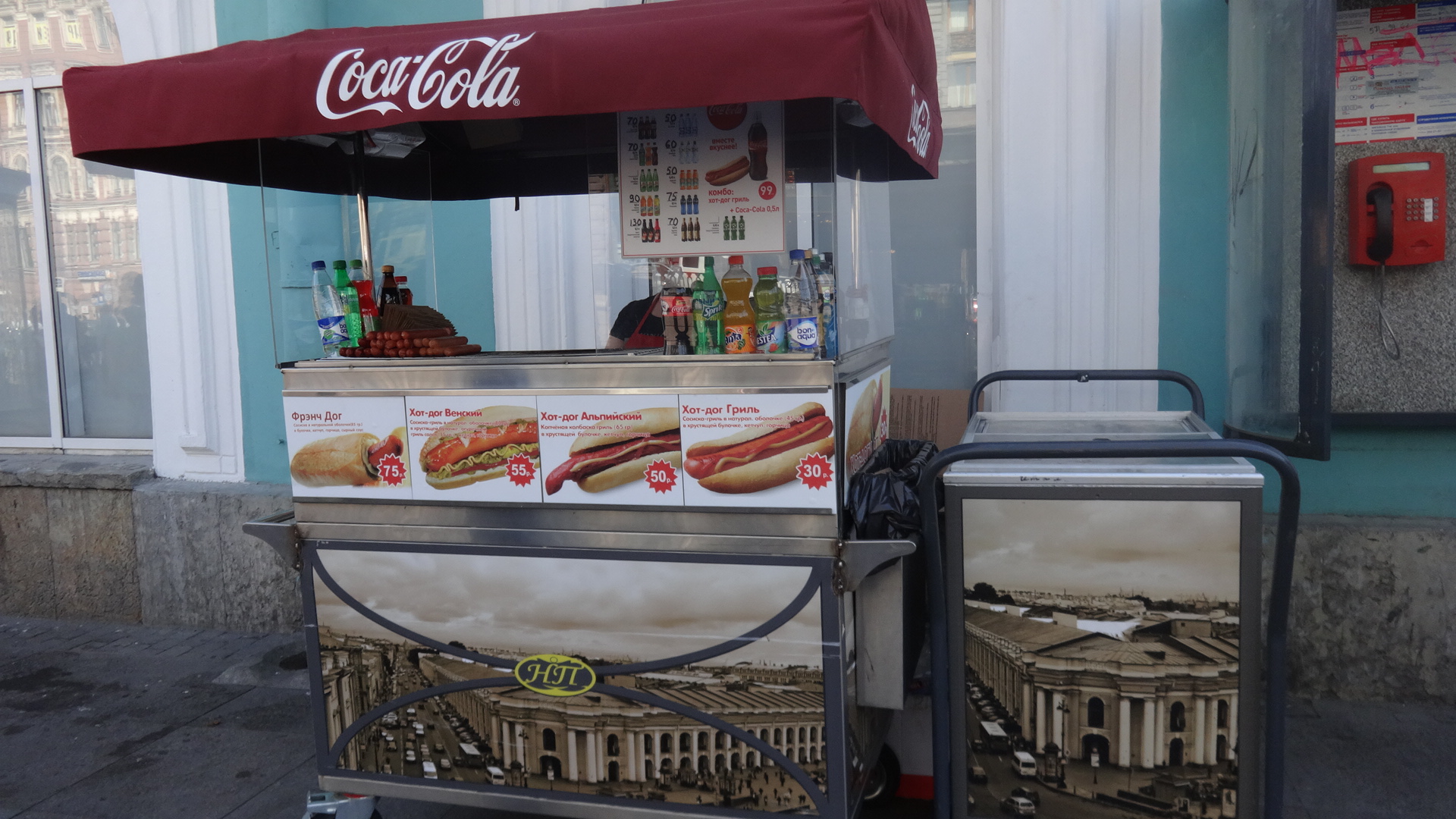 En San Petersburgo para tomar un helado, comprar una lata de refresco o comer un perrito caliente no hace falta entrar en una cafetería. Hay puestos callejeros que venden helados y bebidas frías sin alcohol y también hay sitios en los que se preparan unos deliciosos perritos calientes de diferentes estilos en cuestión de minutos.