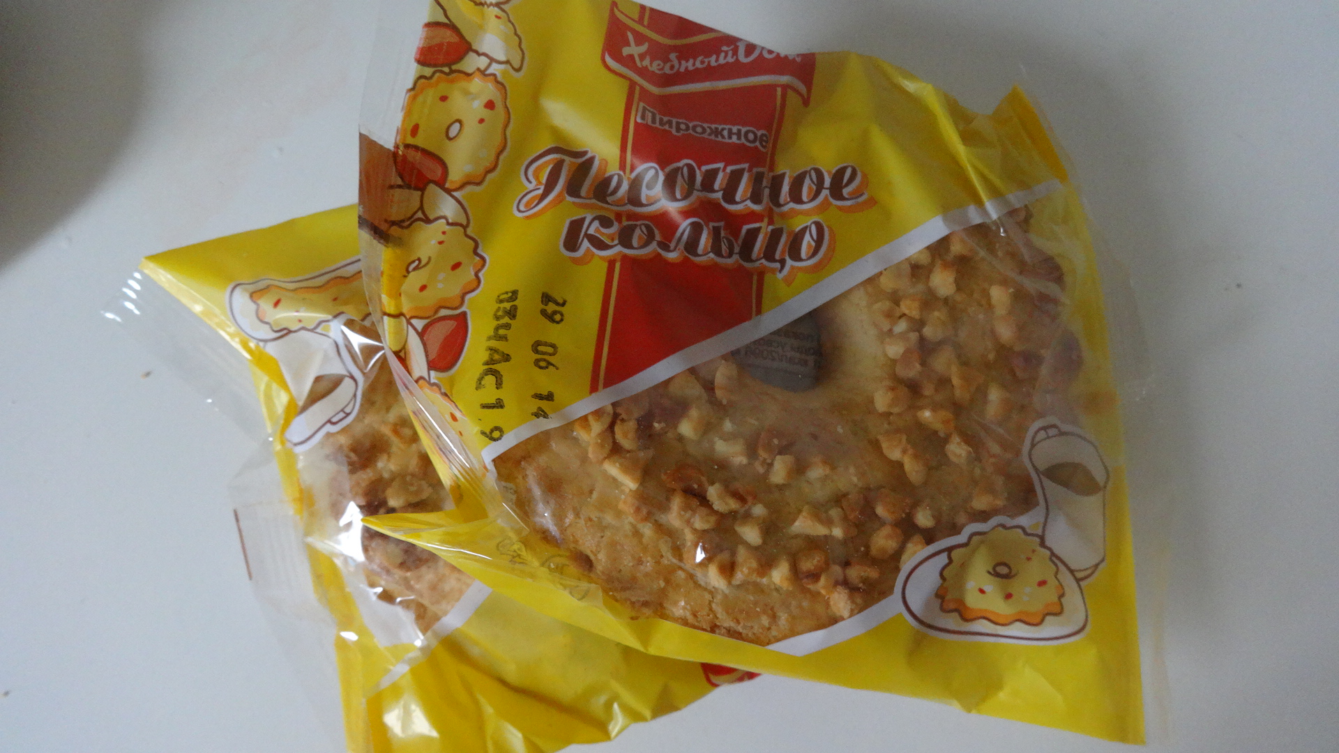 Песочное кольцо (es como una enorme pasta de té cubierta de trocitos de cacahuetes, fue muy típica en la URSS y se vendía en todas las cafeterías posibles, ahora se ha vuelto a fabricar porque la gente la echaba de menos).