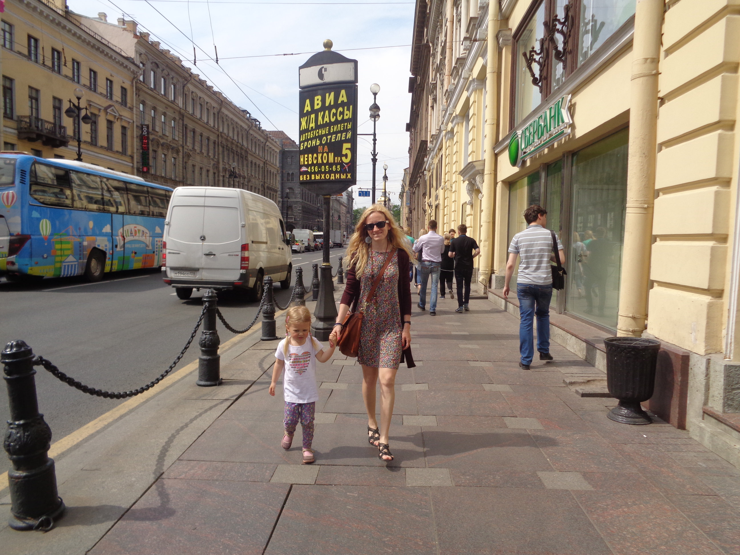 Tuvimos suerte, no había cola en la calle como los días anteriores que pasamos por allí y no nos pudimos ni acercar. Pero aquel día hubo una fuerte tormenta que nos sorprendió a la niña y a mí en las puertas de un banco. Ya estábamos saliendo después de cambiar unos euros, pero tuvimos que quedarnos un rato en las puertas y esperar que cesara de llover. Cuando de la tormenta sólo quedaban las últimas gotas y la Nevski se veía preciosa con las aceras mojadas y brillantes bajo los temerosos rayos de sol, fuimos casi corriendo hasta la calle Zheliábova (eso es, Zheliábova) y entramos en la cafetería.