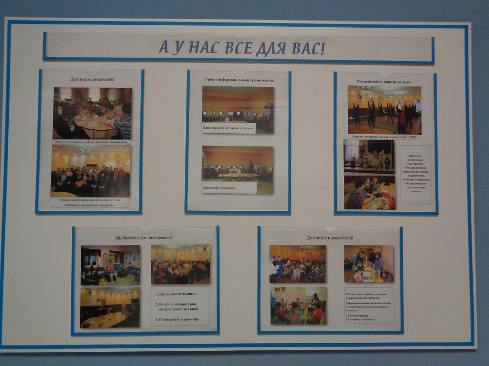 Además de las salas de préstamo, la biblioteca dispone de su propio museo histórico del pueblo Rybátskoie, ofrece charlas, conciertos, excursiones, talleres, clases de ruso como lengua extranjera para los niños inmigrantes, clases de ajedrez, de fotografía, lecturas de cuentos, festivales de poesía, exposiciones y sesiones de cine.