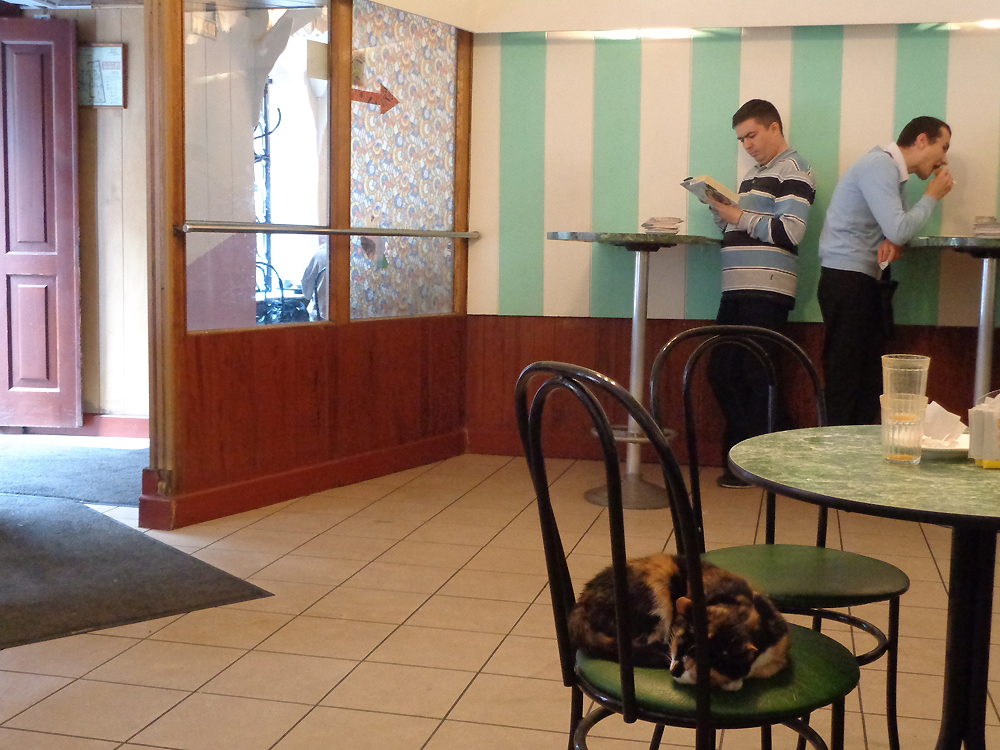 El chico no tuvo problema con la vuelta y tampoco lo tuve yo. En cambio cuando salimos del mostrador con un plato de pyshkas y una taza de café vimos que no quedaba sitio. Entonces me di cuenta de que en una de las sillas puestas alrededor de una mesa ocupada por dos señoras había un gato dormido. Y nadie intentaba moverlo de allí.