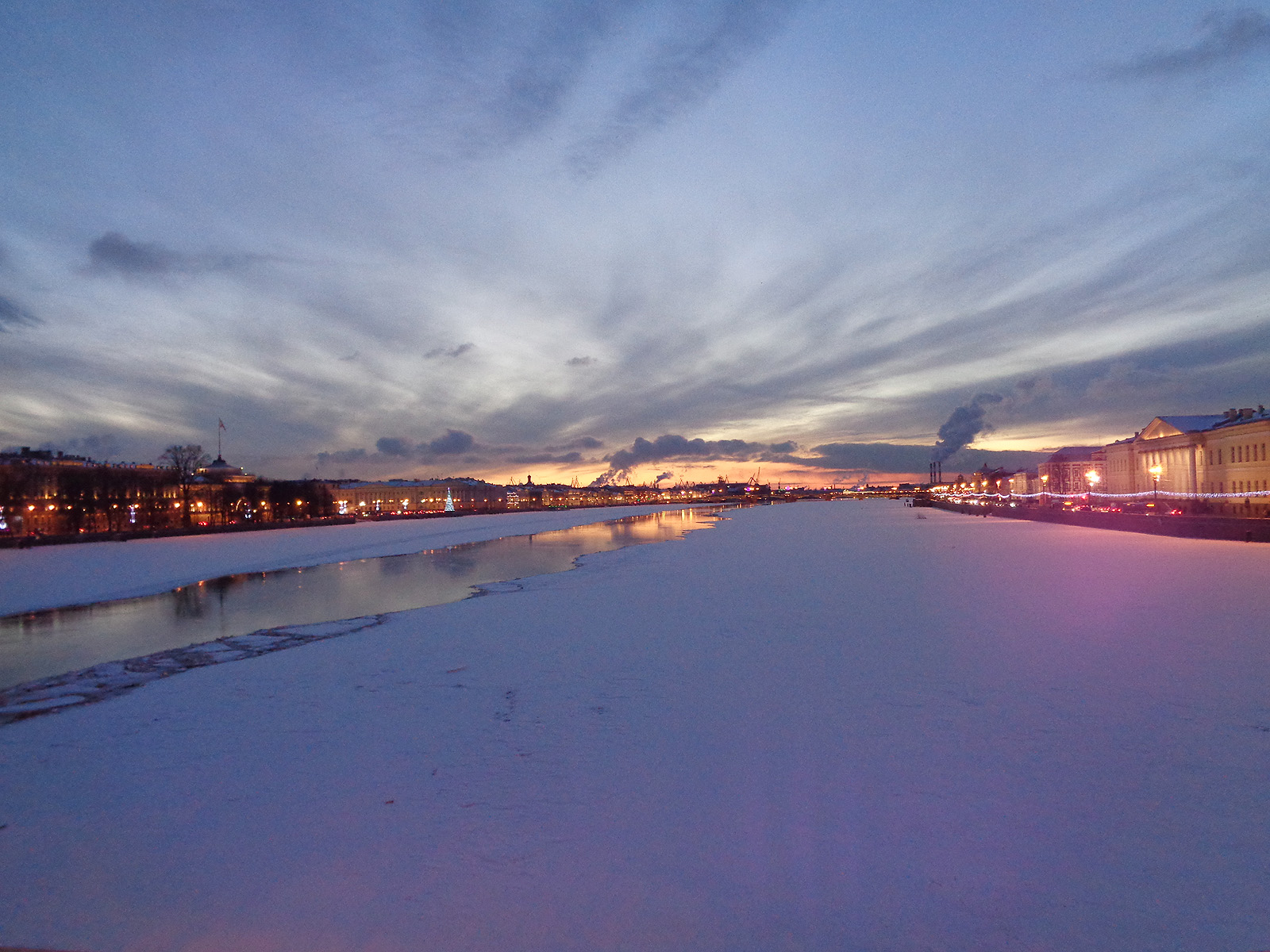 Ir a tomarme un glintwein fue lo primero que hice al salir del metro en la parada “Vasileostróvskaya” la tarde del día 3 de enero. Fue el primer día de las heladas de verdad, aún no eran tan fuertes como unos días después y se podía dar un largo paseo por el Neva. El mismo paseo lo di muchas veces cuando no tenía ganas de meterme en el metro al salir de la Facultad de Filología que queda precisamente en la isla. Entonces iba andando por la 1ª línea (las calles de la isla Vasílievski se llaman “líneas” y están numeradas) hasta el malecón del Neva para luego cruzar el puente Dvortsovy y llegar hasta la Nevski. Son unos 45-50 minutos de camino, o quizá algo más. Un paseo así en invierno requiere preparación: nada mejor que un glintwein para empezar.