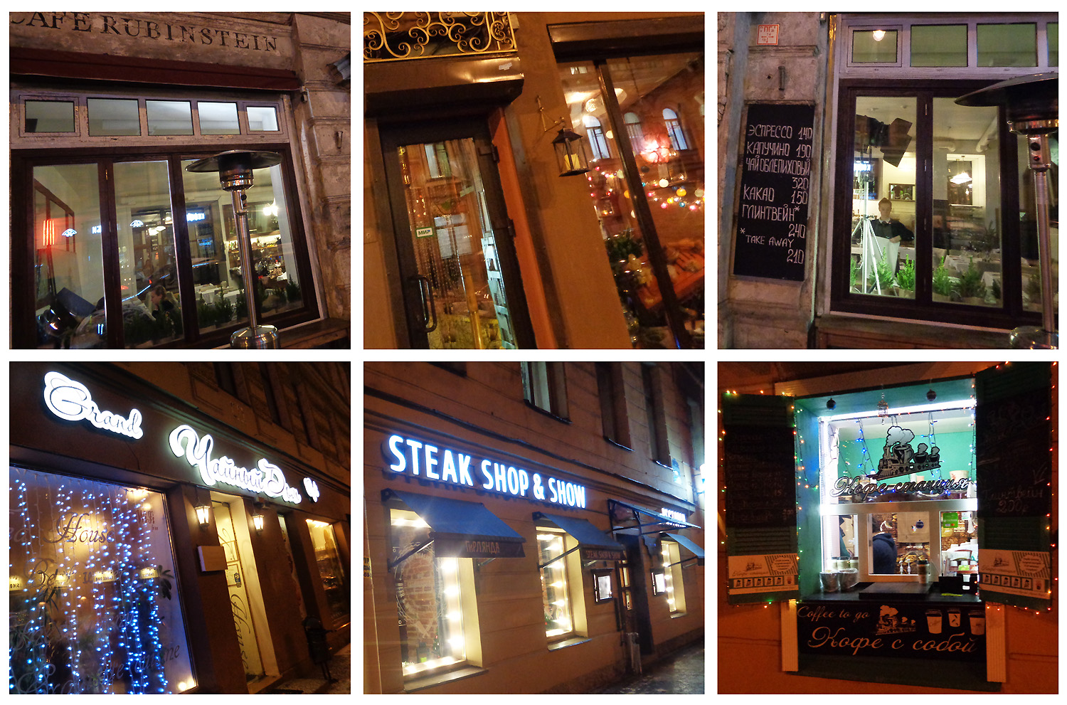 Si se le echa un vistazo desde la Nevski, la calle de Rubinstein parece bastante sombría y melancólica. Esta vez no ha sido adornada para las fiestas y su iluminación habitual es más que modesta, pero basta con empezar a ir pasando de una fachada a otra para poder descubrir locales interesantes.