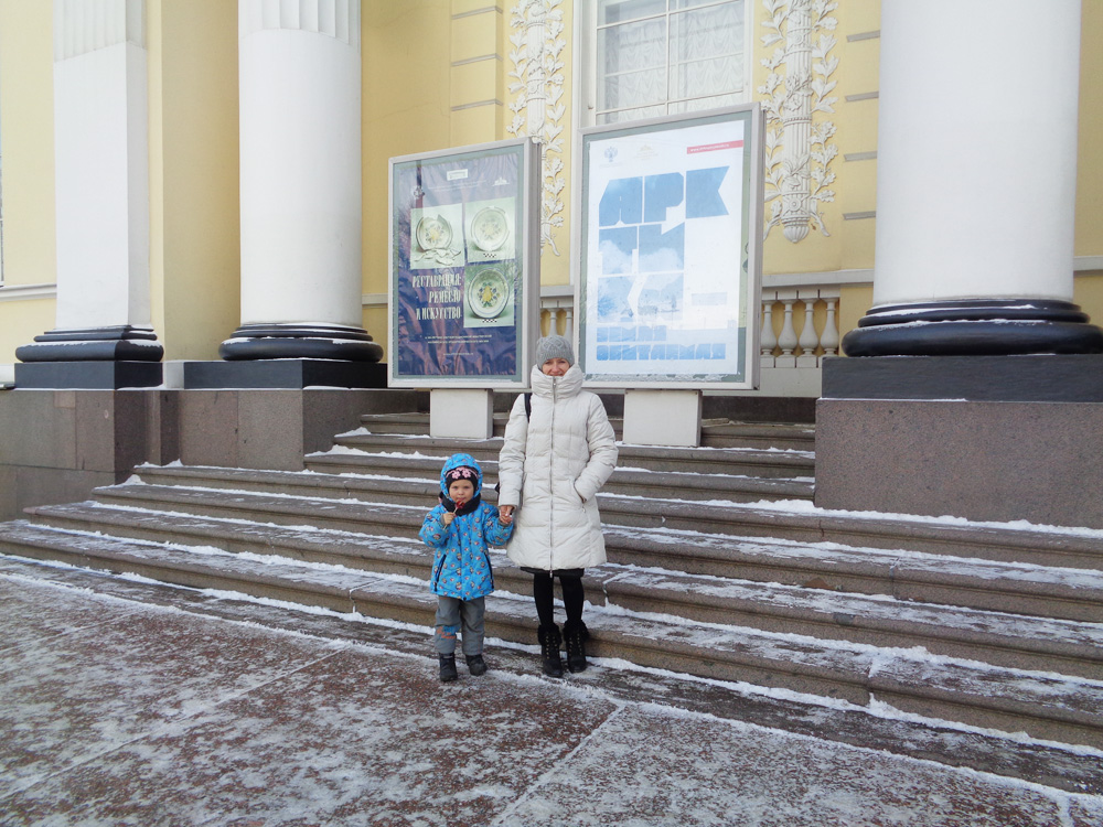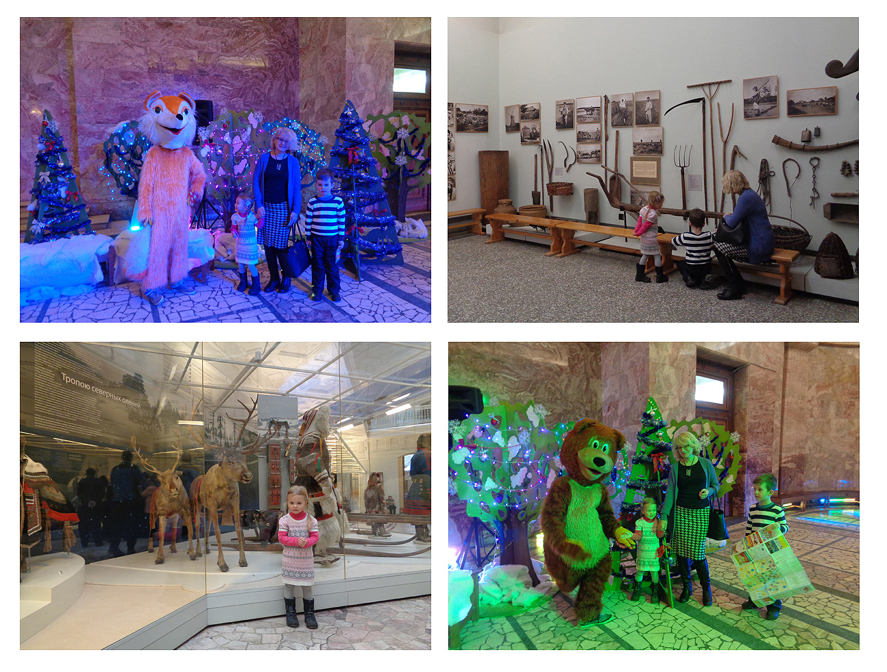 Mi madre y yo nos habíamos preocupado en vano pensando que los niños se podían aburrir en el museo. Al contrario, enseguida les atrajeron las “muñecas grandes” con sus vestidos de colores, adornos y otros detalles interesantes; los trineos de ciervos, barcos con remos, utensillos antiguos. Y a la niña le gustaba ver las casas de distintos grupos étnicos: lo miraba todo corriendo de un lado a otro. Lo que más le gustó fueron los maniquíes vestidos con trajes típicos nacionales del Cáucaso, esas novias georgianas con sus velos y sus pantalones anchos con piedras incrustadas. Y las maquetas de las aldeas ucranianas… A mí también me gustaban a esa edad e incluso más tarde. Esas increíbles maquetas con sus ríos, casas y vacas en los prados me inspiraban. Luego llegaba a casa e intentaba hacer algo parecido de plastilina, cerillas, papel… Recuerdo muy bien aquella sensación de querer llegar a casa y ponerme a hacer una maqueta así.