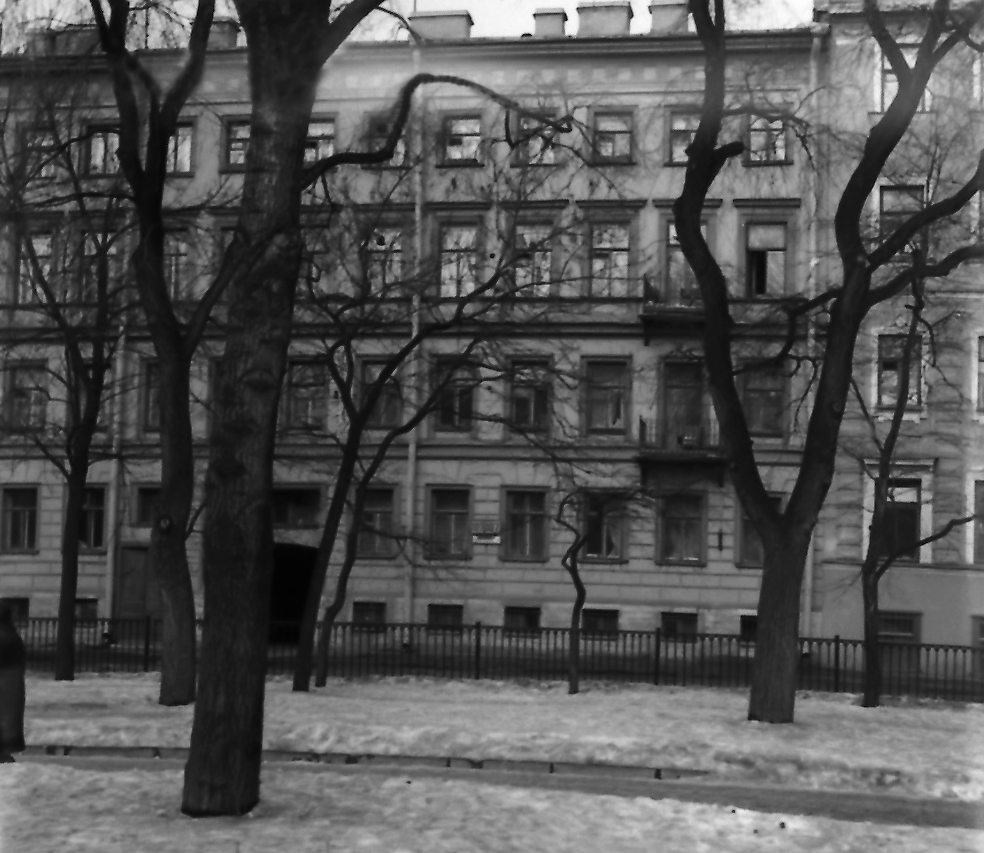 “Kommunalka” es como llamaban un piso comunitario los que vivían en él. “Kommunalka” significaba que un inquilino tenía que compartir con sus vecinos el mismo cuarto de baño, la misma cocina y el mismo pasillo. En los años 1970 la mayoría de los leningradenses vivían en los pisos comunitarios y durante aquella misma década empezó la constucción masiva de las viviendas en los barrios periféricos, los antiguos pueblos de las afueras. Entonces la gente con más dinero y más referencias pudo obtener pisos “propios”. Cuando se casaron mis padres, vivieron durante una temporada en un piso comunitario de un edificio de la plaza de Turguiénev, él de la foto.
