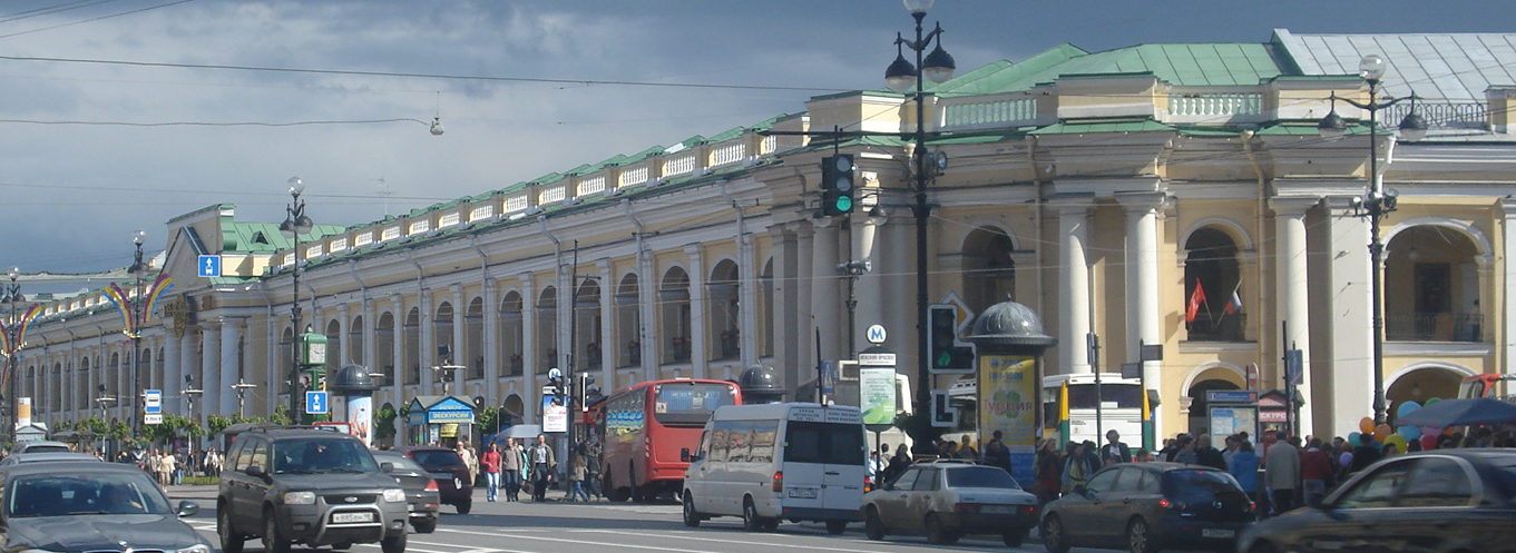 El centro comercial más antiguo de San Petersburgo abrió sus puertas por primera vez en 1785 y hasta en los años del Sitio de Leningrado algunas de sus secciones permanecían abiertas. Fue reconstruido en 1955, cuando las tiendas separadas por paredes se unieron haciendo una larga fila.