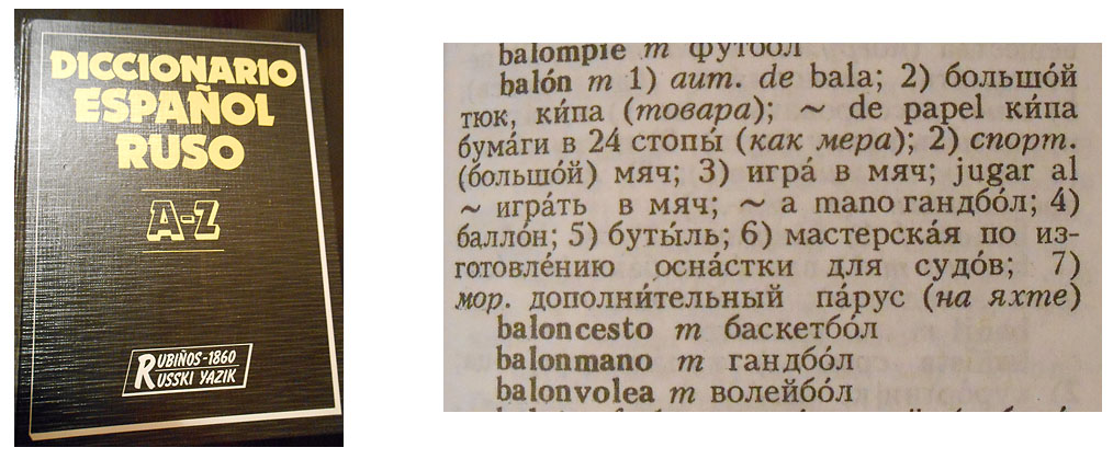 Lo raro es que en el diccionario pequeño de Rubiños, que siempre he considerado de los buenos, el significado de balón como recipiente químico venía el primero, y el balón para jugar venía el segundo. Por supuesto que un estudiante hispañohablante de nivel básico de ruso eligirá el primer significado suponiendo que es el más normal, el que más se usa. Pero el diccionario le engaña y le propone una palabra que apenas se utiliza en la vida cotidiana.
