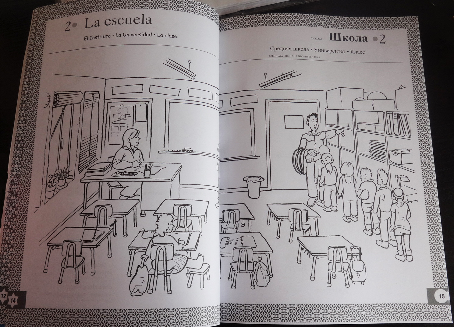 Puede que sea dedicado a los estudiantes de ruso de la edad escolar, sería lógico si tenemos en cuenta que los dibujos parecen hechos con la idea de que al futuro pripietario del libro le entren ganas de colorearlo todo. Aún así, no hay ningún prefacio en el que podamos hallar tales consejos para el uso del libro. Pero, aparte de los dibujos, se puede ver que una parte del vocabulario son palabras “escolares” como tiza, pizarra, rotulador, pegamento, goma de borrar, etc. Y también “animales”, “alimentos”, familia”, “cuerpo”, “ciudad”, etc. Todo lo más básico e imprescindible.