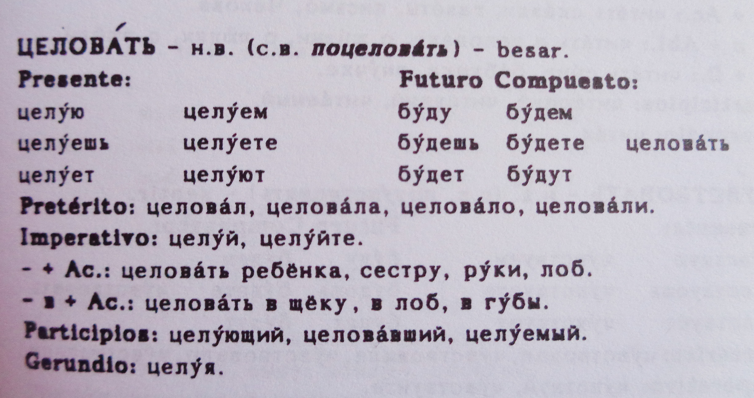 Cuando abrí “Guía del verbo ruso” y vi los montones de verbos rusos colocados en orden alfabético, con sus pares aspectuales, sus ejemplos de conjugación y de su uso con los casos y preposiciones, enseguida me acordé de un diccionario de verbos españoles que un día pude hojear de la misma manera.