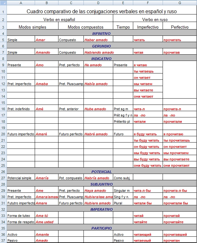 Para hacerme una mejor idea de la correspondencia entre ambos sistemas verbales me he confeccionado una tabla con la que, sin mayores pretensiones, me he sentido bastante auxiliado cuando estaba por perder el rumbo. Te la envío por correo por si crees que puede tener alguna utilidad para alguien más.