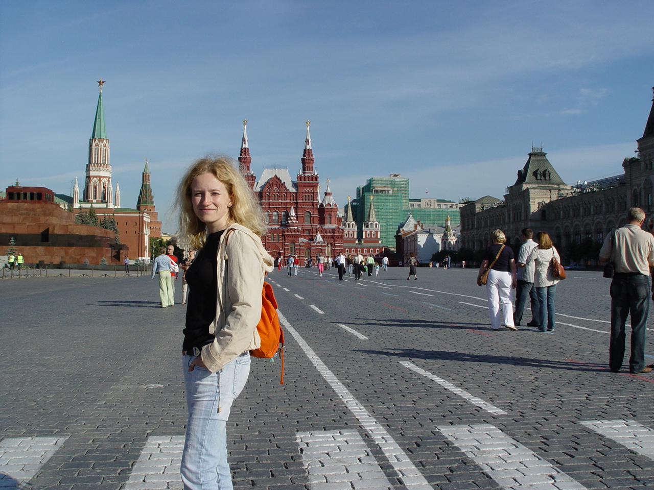 Llegamos a la Plaza Roja. Estaba vacía por la mañana y parecía aún más enigmática de lo que es en realidad. Hicimos muchas fotos que parecen postales. El Cremlin, el cielo azul, el sol… lo típico. Dimos un largo paseo por la plaza y sus alrededores, salimos a la calle Tverskaya, y de la Tverskaya a una calle estrecha donde había muchas cafeterías con las terrazas puestas. Tomamos unos cafés en una de aquellas terrazas, y luego el hermano de Borís fue a mirar dónde había dejado el coche mientras nosotros nos dirigimos a la Catedral de Cristo Salvador. De la Catedral nos separaba una enorme carretera con un tráfico tan horroroso que pensé que nunca cruzaríamos al otro lado. Y que si cruzábamos, no llegaríamos vivos. Nos pusimos en el semáforo a esperar y justo entonces llamó el hermano de Borís que se estaba volviendo loco porque no encontraba el coche. Al final decidimos reunirnos con él y ayudarle a encontrar su vehículo.