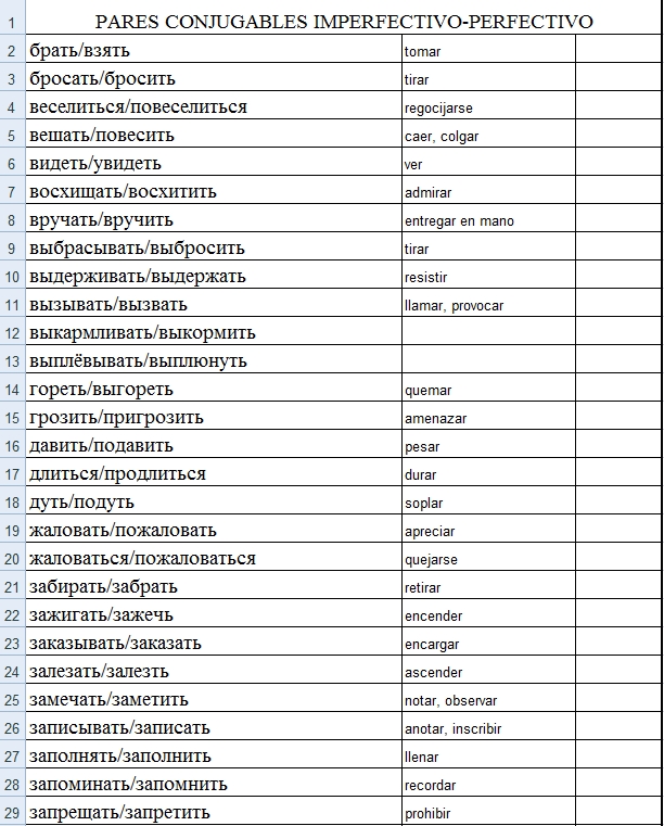 Hola a todos una vez más, Acabo de ver un mensaje que me ha enviado Antonio (¡Hurra! ¡Gracias, gracias, Antonio!) y estoy muy contenta porque ya puedo publicar aquí: - los 113 verbos ofrecidos por Pavel - con sus pares aspectuales (que les he encontrado yo el otro día)... - ¡y con la traducción al español realizada por Antonio!Aquí está esta estupenda tabla para que podáis guardarla o estudiarla directamente: Un saludo y que tengáis una buena semana. До встречи! Елена.