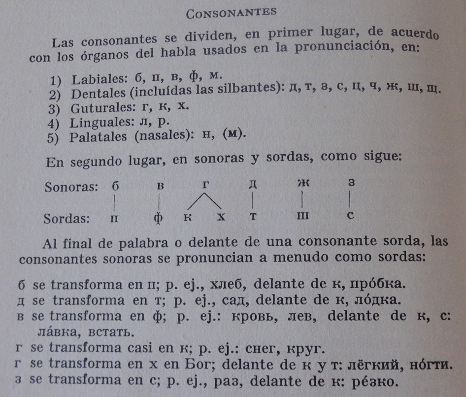 (…) Aunque las vocales rusas pierden su valor completo cuando figuran sin acento, es un gran error pretender asignarles ningún otro valor definido. Es una gran equivocación decir que la primera o de который es como una a, o que вода se pronuncia vadá. Está demostrado que los signos internacionales de fonética no representan satisfactoriamente los sonidos rusos. Se ha intentado crear nuevos signos, los cuales se han ido desarrolladno hasta convertirse en fórmulas bastante complicadas, pero su empleo es muy limitado. Hay un equivalente en español para casi todas las vocales rusas, e incluso el sonido de la ы se aproxima mucho al de la i española.