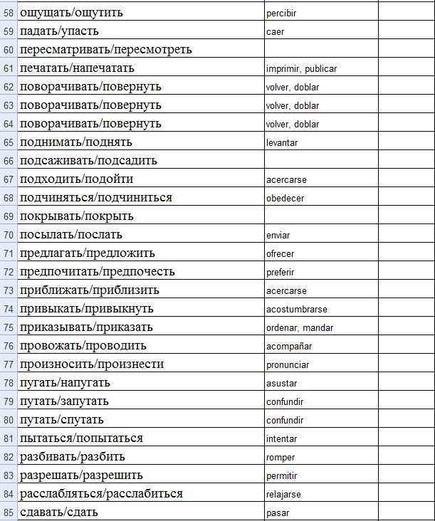 Hola a todos una vez más, Acabo de ver un mensaje que me ha enviado Antonio (¡Hurra! ¡Gracias, gracias, Antonio!) y estoy muy contenta porque ya puedo publicar aquí: - los 113 verbos ofrecidos por Pavel - con sus pares aspectuales (que les he encontrado yo el otro día)... - ¡y con la traducción al español realizada por Antonio!Aquí está esta estupenda tabla para que podáis guardarla o estudiarla directamente: Un saludo y que tengáis una buena semana. До встречи! Елена.