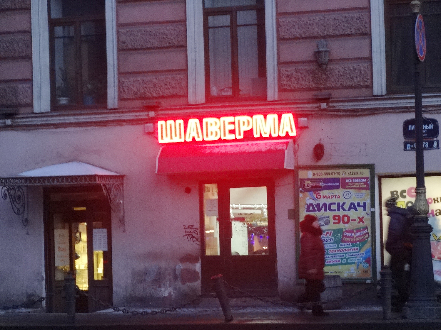 Esta vez fui suficientemente valiente y entré, porque estaba completamente helada después de un largo paseo que di por el malecón de Fontanka. Aquel día las temperaturas de los termómetros de la ciudad no paraban de bajar, y lo que más me apetecía era un té negro con bastante azúcar y… la shavierma de Liteiny.