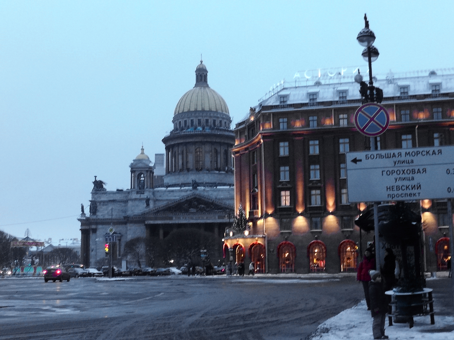 Mientras la estaba comiendo en la cafetería entró un grupo de hombres altos y robustos que hablaban muy alto, se reían a carcajadas y se mostraban muy alegres. Pidieron shaviermas para llevar. A la chica uzbeca la tuteaban, pero no parecía que la hubieran conocido antes. El ruido y alboroto enseguida me empezaron a molestar, así que comí el resto de mi shavierma rápido y salí a la Liteiny con el té en la mano. Aún quemaba mucho y tuve que parar en una esquina de la Nevski para poder tomarlo tranquilamente. Y la Nevski estaba preciosa…