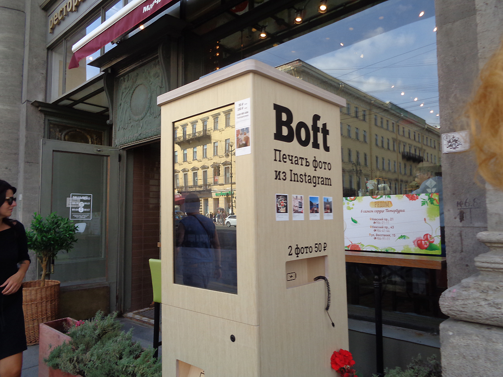 Las máquinas de Instagram son unas cajas grandes de distinto diseño que ponen "печать фото из Instagram". Un ruso que cuida su lenguaje fruncirá el ceño al ver esta frase. No porque el nombre del Instagram esté puesto con su letra latina original, ¡eso no es nada en el mundo moderno!, sino porque la palabra "Instagram" no está declinada mientras que la preposición "из" requiere el uso del genitivo. Cualquiera que lea esto dirá que está mal, que tiene que ser «Инстаграма». Pero como es una mezcla de ruso e inglés, está permitido. Un horror… Para imprimir alguna foto lo que hace falta es ser usuario de Instagram y tener imágenes obtenidas con el móvil y subidas a la web. Luego sólo queda introducir el nombre del usuario, elegir las fotos y pulsar el botón. Y ya saldrán en papel.