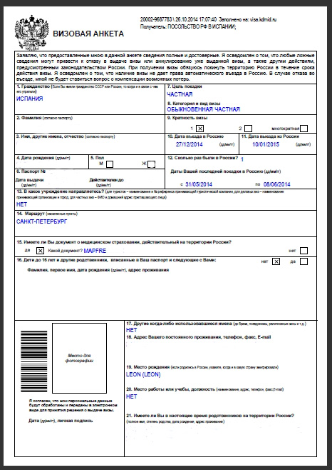 Al recibir el visado hace falta comprobar con mucha atención toda la información que viene en él, sobre todo las fechas y la forma en la que van escritos los nombres y apellidos, tanto los del solicitante como los del familiar ruso.