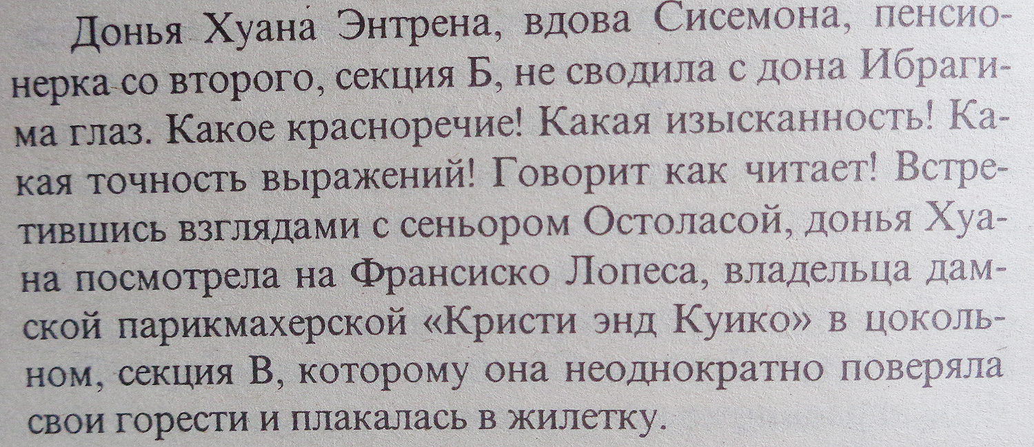 Hubo una época en la que no leí otra cosa que novelas de autores españoles e hispanos, pero, como aún me era imposible leerlos en original, me los compraba traducidos al ruso. También los cogía en la biblioteca del barrio. Me guiaba por los nombres de los autores, por sus países de origen, pero también me era imprescindible el saber quién era el autor de la traducción. Fue entonces cuando conocí nombres de los traductores rusos de la literatura en español: Geleskul, Trauberg, Lysenko, etc. Aquellos libros quedan en las estanterías de mi casa en San Petersburgo y sólo uno de ellos está aquí conmigo: “La colmena” de Camilo José Cela, editada en Moscú en 2002, traducida por E. Lysenko, el libro de la foto.