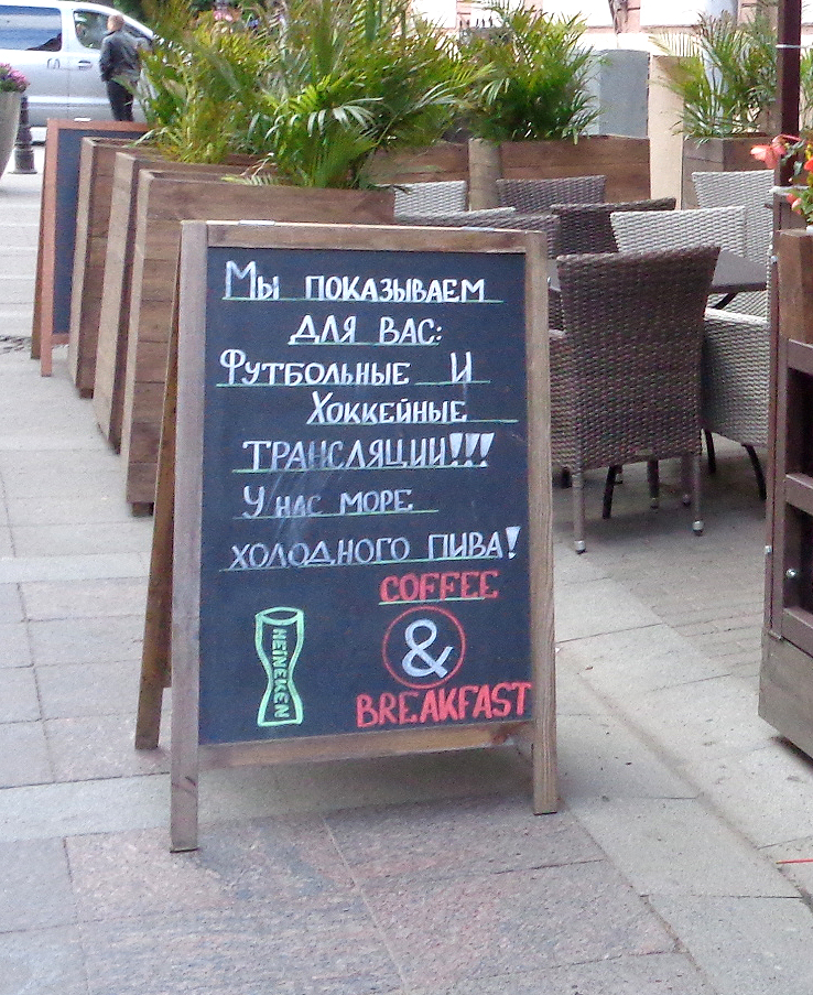 Las pizarras que anuncian los menús de las cafeterías y restaurantes no son ninguna tendencia: se han visto en las calles durante décadas. Pero la verdad es que nunca he visto tantas pizarras de esas en las calles de San Petersburgo. Este verano están por todas partes: unas diseñadas profesionalmente, otras muy poco originales, pero la mayoría lleva letra manuscrita y por eso decidí fotografiarlas.