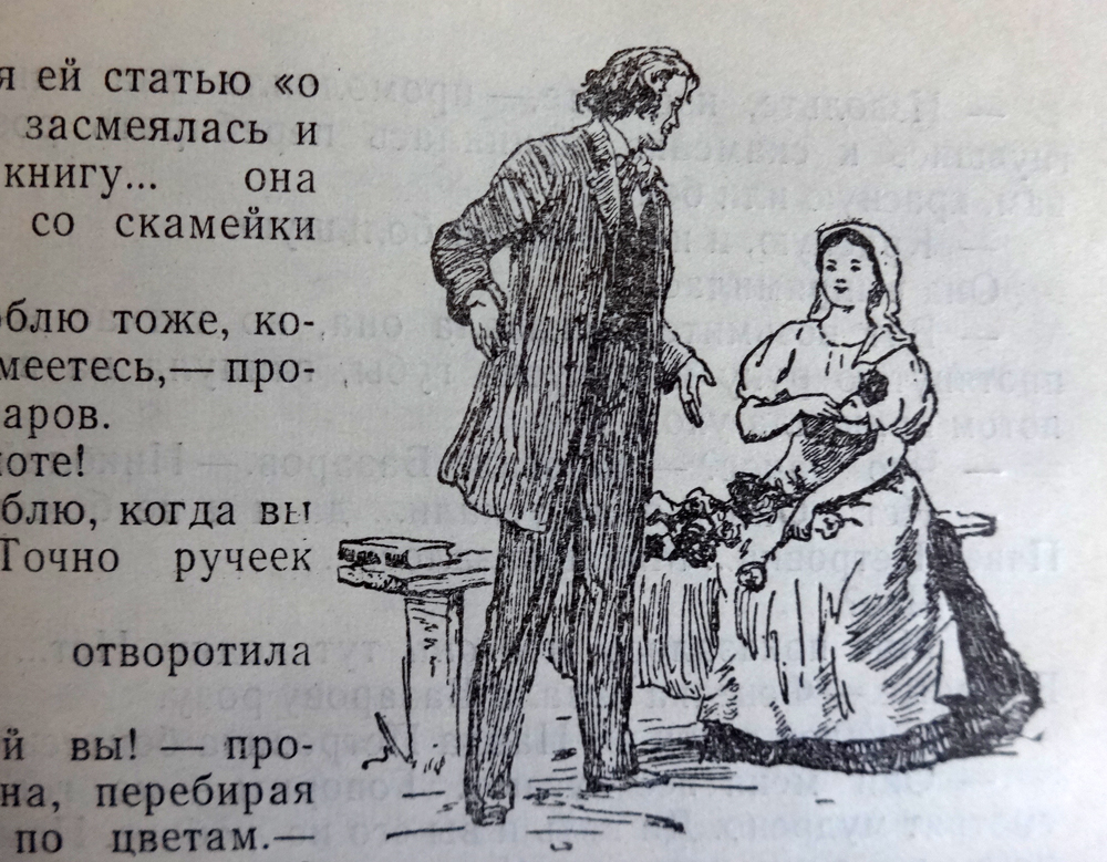 Está claro que mucha gente rusa asocia el nombre de Turguénev co las clases de literatura en el colegio, pero hablemos de la gente que abre una y otra vez las novelas de Turguénev a lo largo de su vida, porque busca en ellas la paz y la tranquilidad que es difícil de encontrar hoy día. Son los que leen a Turguénev para encontrarse de repente en alguna posada de algún pueblo alejado de Moscú, en plena tarde veraniega, y escuchar las conversaciónes de la gente del siglo XIX en las que un ruso muy cortés y muy correcto se mezcla de forma sútil con el francés y el latín. Para alejarse de la vida cotidiana de hoy con su ritmo y sus preocupaciones no hay nada mejor que dar un paseo por un jardín descrito por Turguénev y ser testigos de una charla amorosa entre Bazárov y Fénechka en la novela “Padres e hijos”. Por eso, y no por pertenecer a aquella parte de lectores de la que hablé primero, de vez en cuando yo misma leo a Turguénev y por eso lo leen algunas personas de mi alrededor.