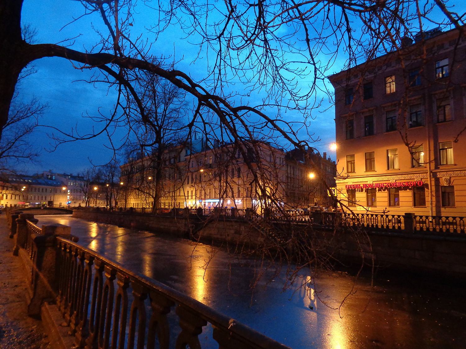 En un día de invierno húmedo, frío y sin nieve las aceras poco iluminadas del canal y las fachadas desgastadas de sus “casas de renta” pueden resultar depresivas a cualquiera. Ha pasado más de un siglo después de que fueron escritos el “Crimen y castigo” o “Humillados y ofendidos” , pero poco cambió el ambiente de la zona. Si Raskólnikov fuera una persona de verdad y volviera a su casa en Grazhdánskaya, 19, quizá le extrañaría ver una placa y un monumento dedicado al escritor y a su obra en la fachada, pero tardaría en darse cuenta de que el siglo ha cambiado ya dos veces. Lo mismo le pasaría a la vieja prestamista que vivía en el número 104 del malecón del canal Yekatieríninski y a Sonia Marmeládova cuya casa 73 queda en la otra orilla.Y también a otro personaje, Parfión Rogózhin de “El Idiota” que vivía al lado, en la calle Gorójovaya.