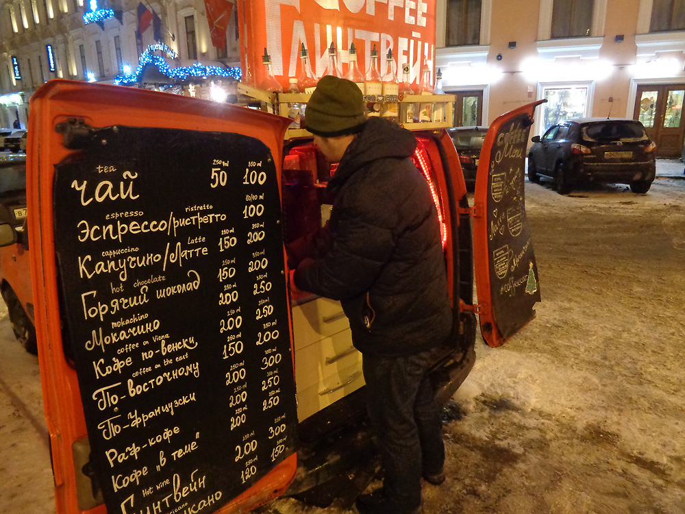 En invierno todas las cafeterías, excepto aquellas que no tienen licencia para vender alcohol, tienen glintwein. Su precio puede variar desde 99 rublos hasta 250-300 (1 euro = 62 rublos). Los puestos de bebidas callejeros también lo tienen, y no hay nada mejor que tomarlo en la calle, andando o contemplando la belleza de la ciudad desde alguno de sus puentes.