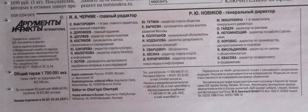 El «Аргументы и факты» (http://www.aif.ru), o simplemente el «АиФ» se edita en Rusia desde 1978 y siempre ha tenido mucho éxito. Alguna vez me lo he comprado en Píter, y a pesar de que prefiera otros periódicos, como, por ejemplo, el “Санкт-Петербургские ведомости» (http://www.spbvedomosti.ru) o el «Час пик» (http://www.chaspik.spb.ru), tengo que admitir que es un verdadero placer leerlo. Sus periodistas son profesionales, hasta diría que tienen talento, los textos son de buenísima calidad, siempre se puede encontrar artículos interesantes, etc. Es un gran periódico, el «АиФ». La versión “europea” (se titula «Аргументы и факты: Европа») es la misma que la rusa.